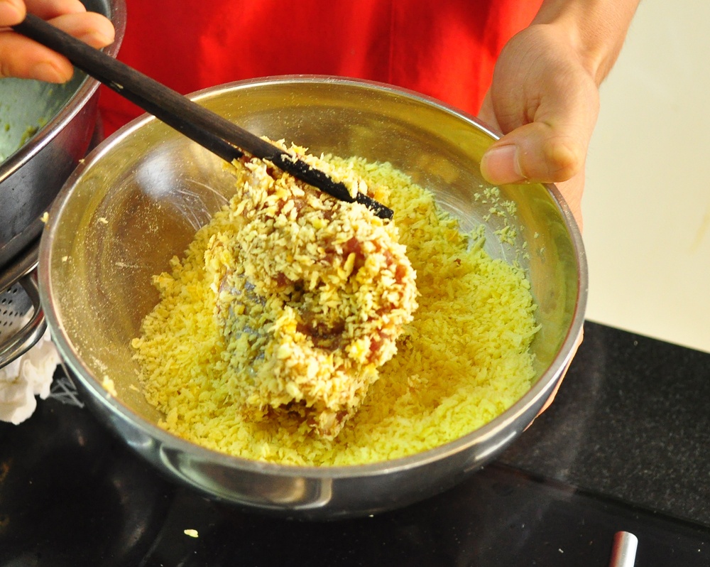 - Lăn qua bột chiên xù.
