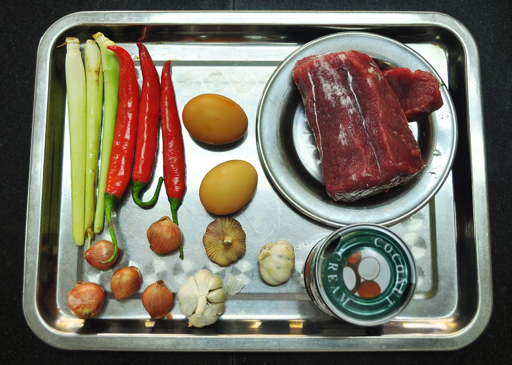 - Tẩm ướp thịt bò: cho hành, tỏi, sả băm nhỏ vào, bỏ thêm 1 thìa nước cốt dừa, 1 thìa sa tế, chút ớt bột, hạt tiêu và chút gia vị.