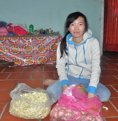 | Yến Nhi đang lột vỏ củ tỏi kiếm tiền phụ giúp mẹ. Ảnh: Tiền Phong. |
