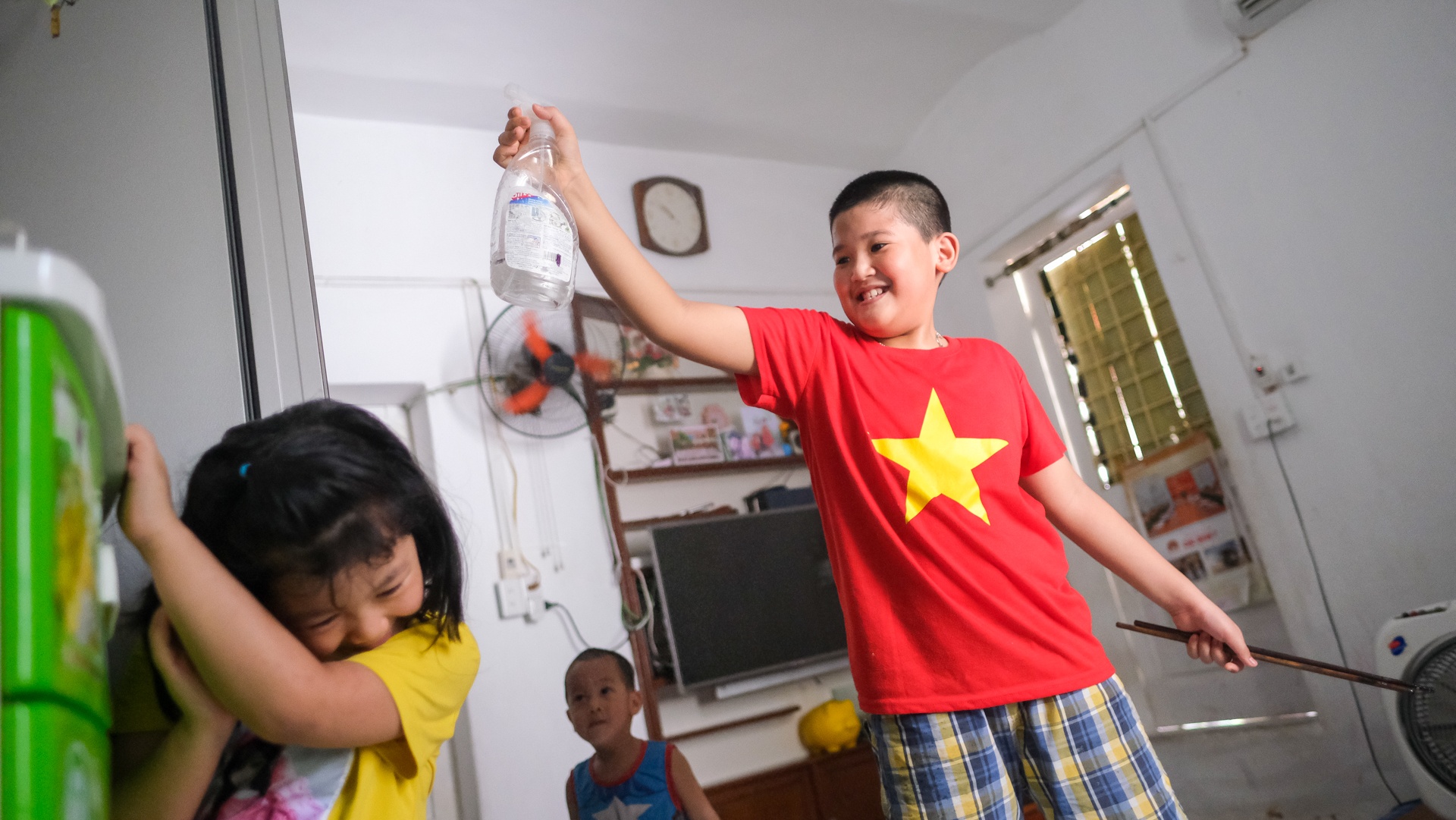 | Mẹ không cho bọn con dùng điện thoại thông minh hay mở tivi, vì vậy con phải nghĩ ra nhiều trò để chơi cùng các em. Khi thì xếp lego, khi thì chơi nối chữ, khi thì cùng nhau vẽ một bức tranh,... |