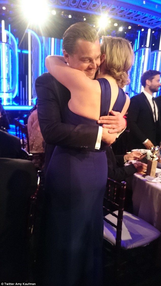 Trong giờ phát quảng cáo, Leonardo DiCaprio trở về bàn tiệc từ sân khấu sau khi nhận tượng vàng. Kate Winslet lập tức chạy lại và trở thành người đầu tiên ôm chầm lấy bạn diễn năm xưa. Nhận được tình cảm thân thương từ người đẹp, Leo nở một nụ cười mãn nguyễn.