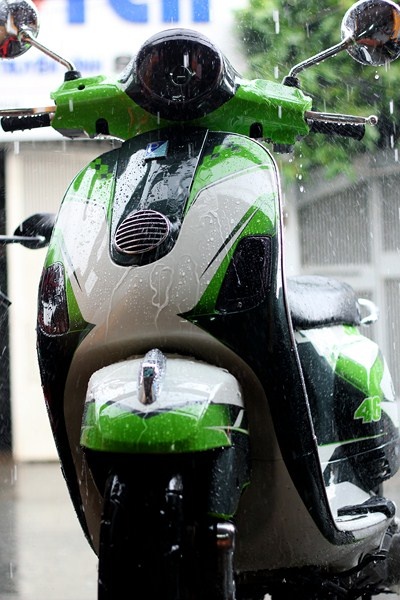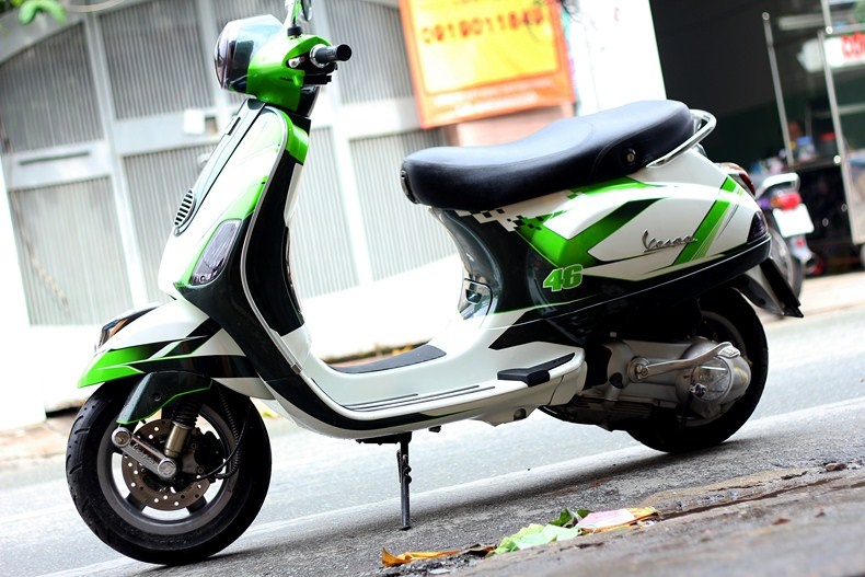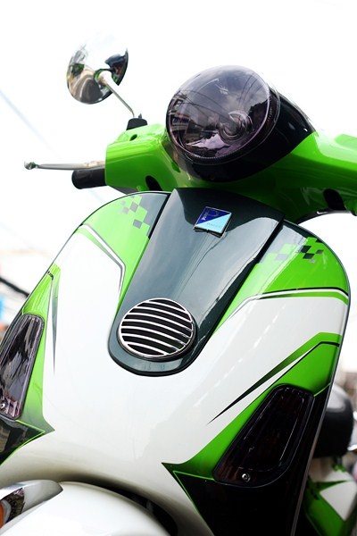 | Chiếc Vespa LX nguyên bản màu trắng. Dựa trên ý tưởng màu xanh lá mạ ở các mẫu xe đua MotoGP, sắc xanh trên thân xe, đầu xe, chắn bùn trước kết hợp nền trắng tạo phong cách trẻ trung, sành điệu. |