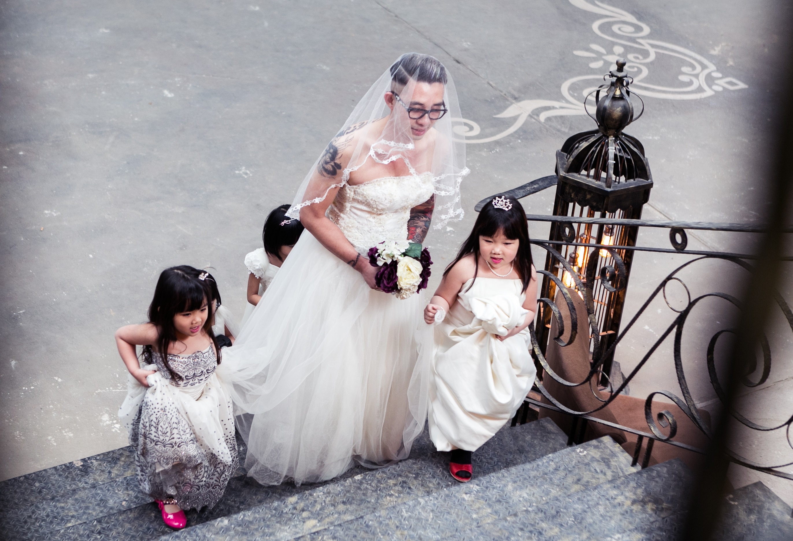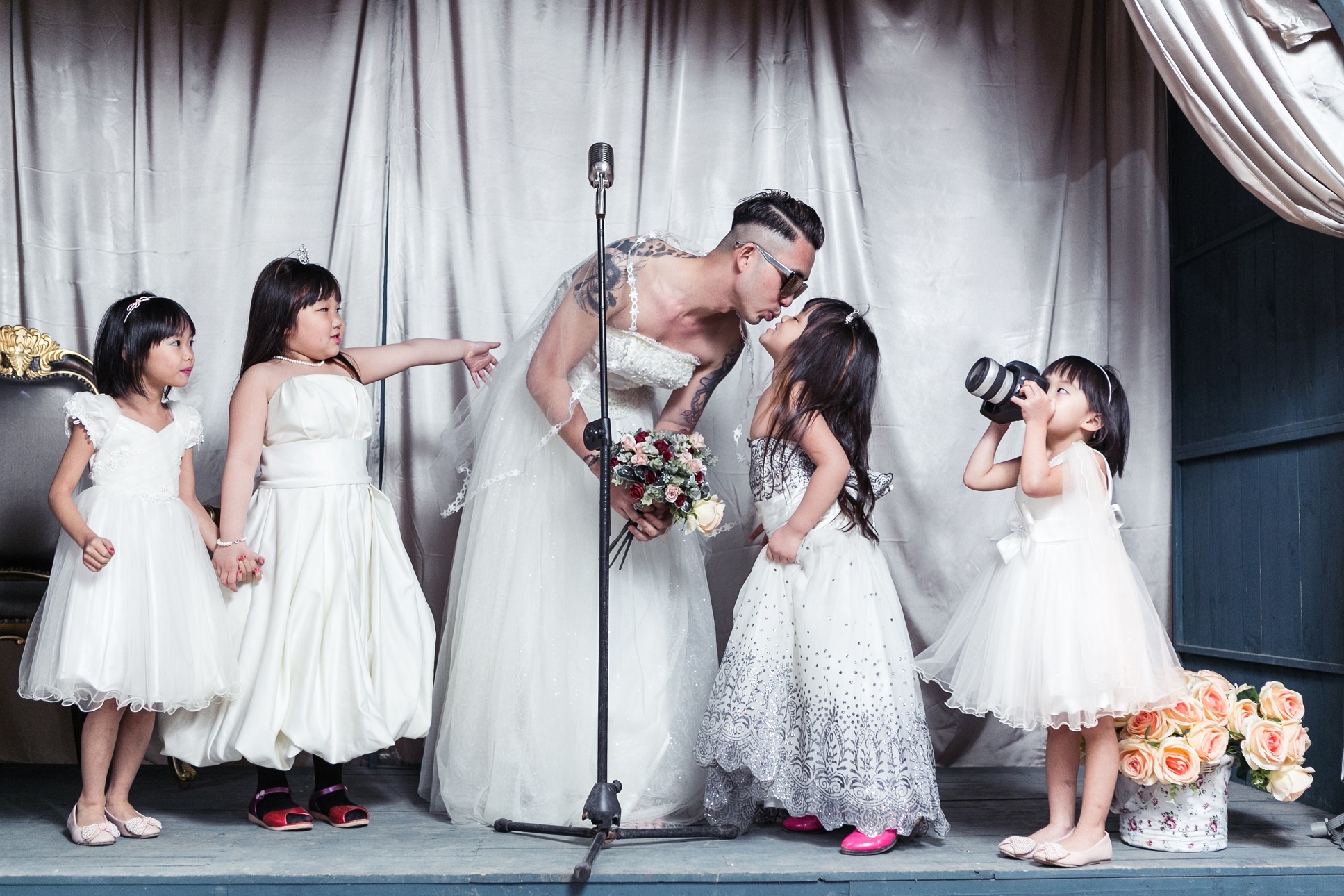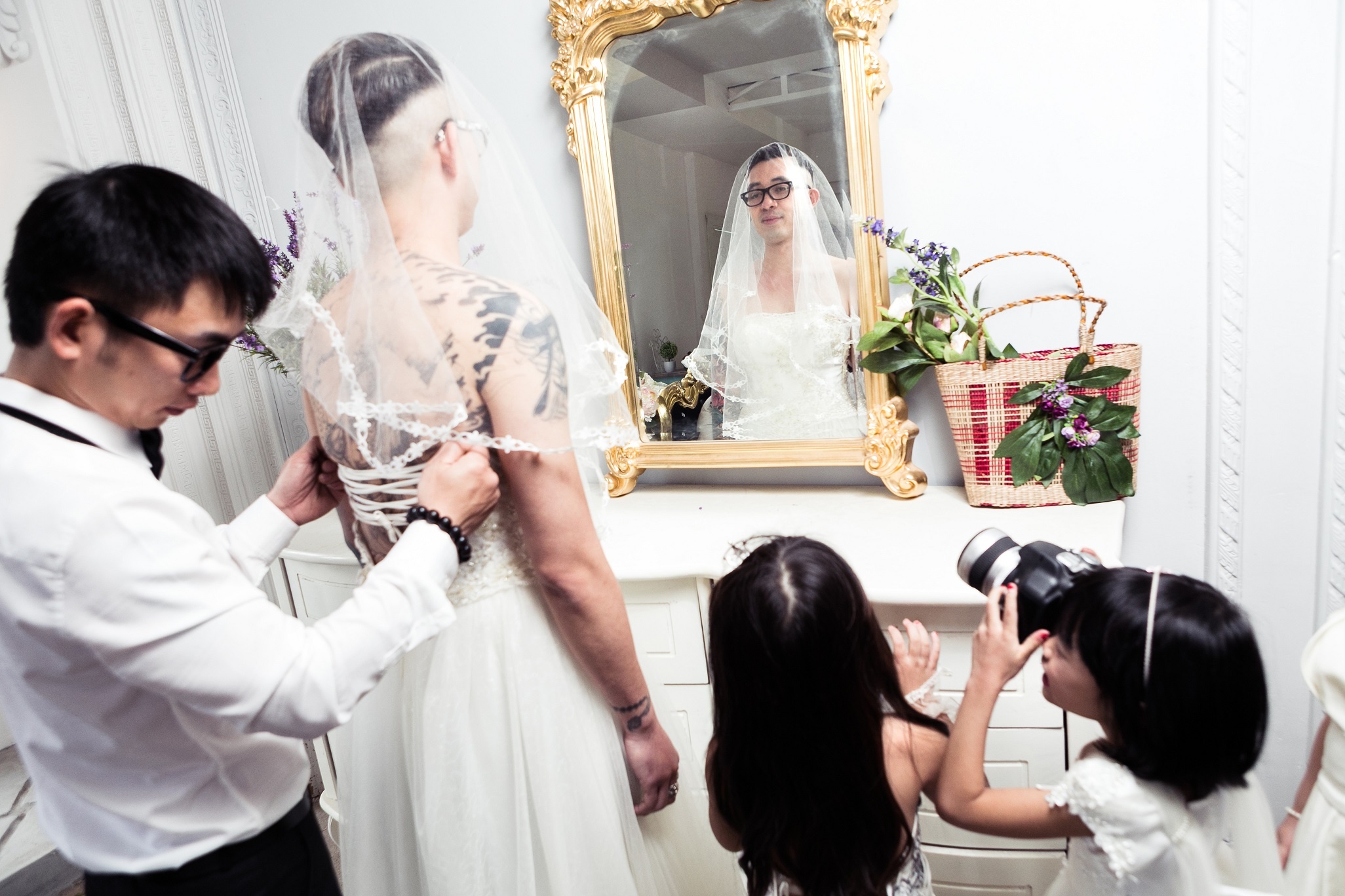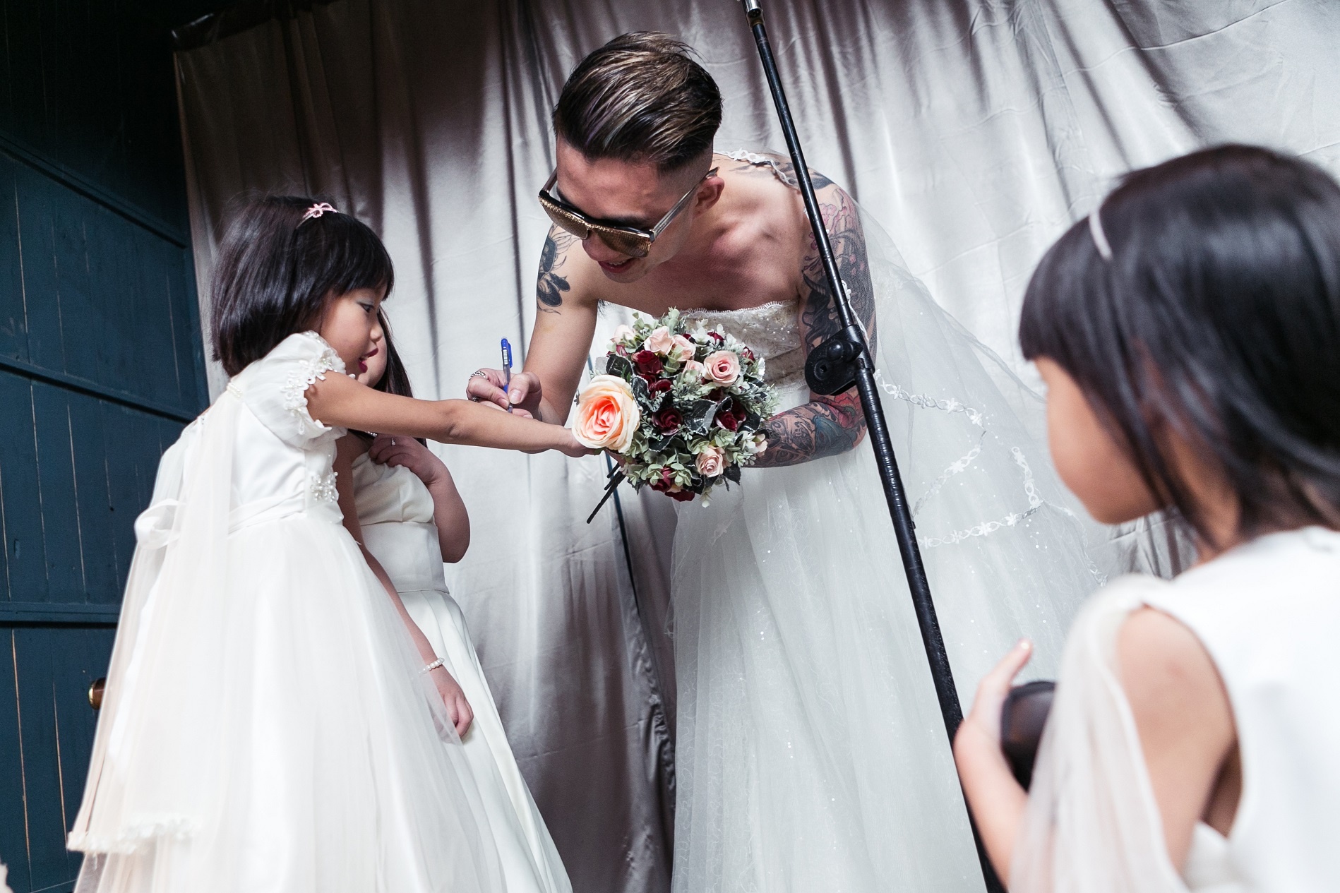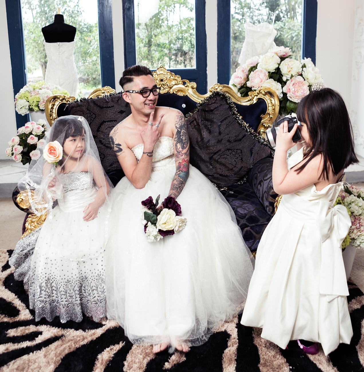 | Loạt ảnh gây chú ý khi Phan Thành có các hình xăm lớn hai bên tay và khoác lên mình bộ váy cô dâu. |