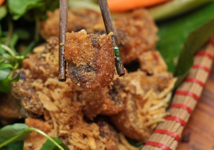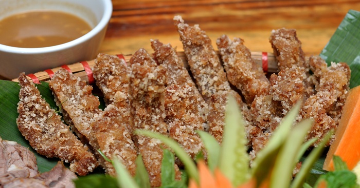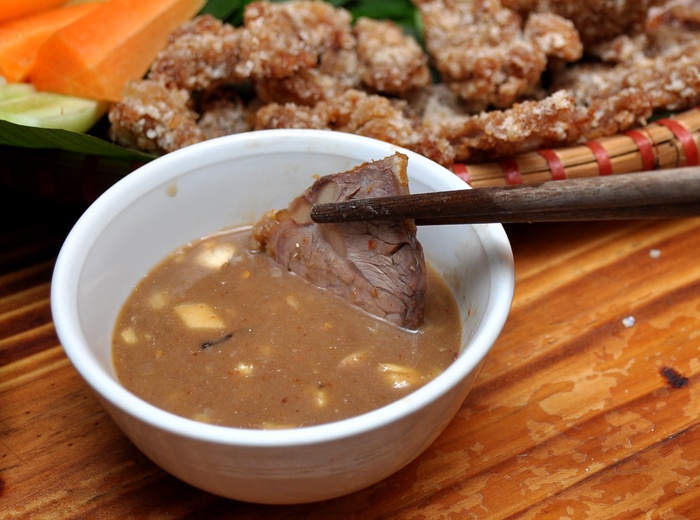 Bò mẹt tất nhiên không chỉ để phục vụ cánh mày râu nhắm rượu. Các chị em chắc hẳn hợp với bò chiên Thái. Bò chọn phần thăn tẩm với bột chiên rồi chấm tương ớt, món này nên ăn ngay lúc mẹt bò vừa mang ra thì mới bảo đảm giòn ngon nóng hổi nhất.