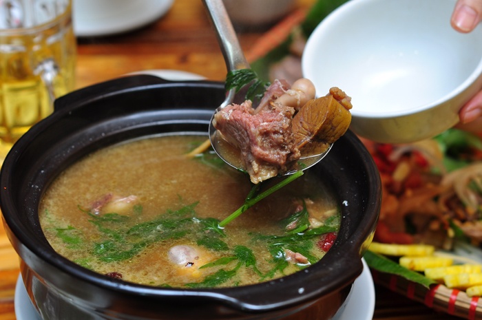 Một mẹt bò 6 món có thể nói đã rất phong phú, nhưng vẫn sẽ thiếu sót và khô khá nếu không có một món nước cho khách xì xụp. Đó là lí do bò mẹt luôn đi kèm niêu canh thuốc Bắc nóng hổi, có đủ đuôi, pín gân hầm ngọt chất. Món ăn làm khách ấm bụng mà cũng có tác dụng giải rượu rất tốt.
