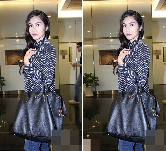 Nữ diễn viên Bỗng dưng muốn khóc lựa chọn túi Prada to bản màu đen với giá gần 60 triệu đồng để phối cùng quần jeans và áo sơ mi chấm bi. |