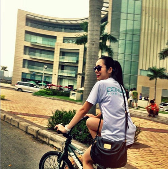 Cô trẻ trung đạp xe trên phố và không quên mang theo túi Marc by Marc Jacobs giá khoảng gần 8 triệu đồng. |