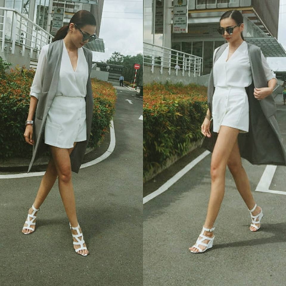 Một gợi ý khác khi kết hợp tông xám với cả cây trắng nữ tính của Thanh Hằng. Ảnh: T.Hằng.