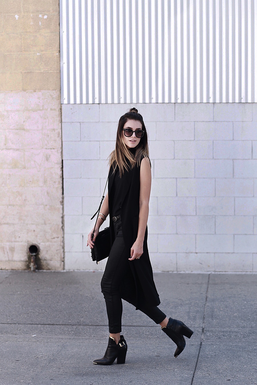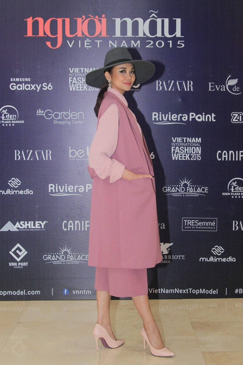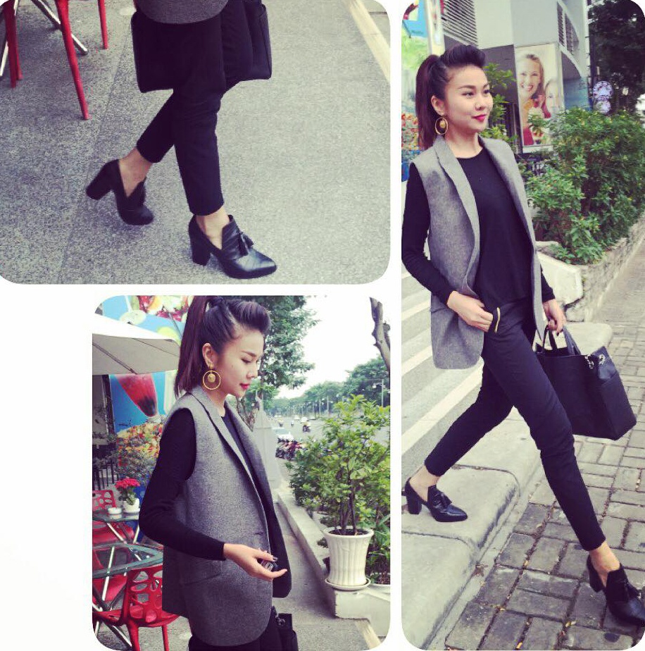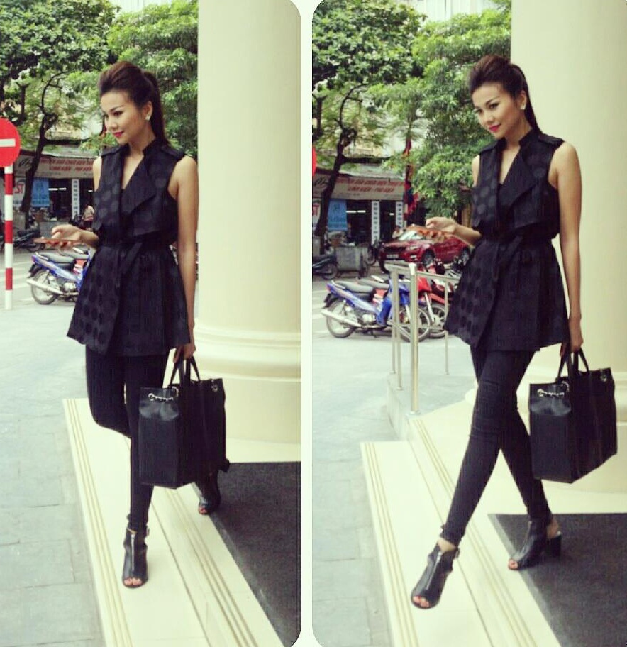 Cũng với cây đen, cô khoe vẻ mạnh mẽ cùng vest xám. Ảnh: T.Hằng.