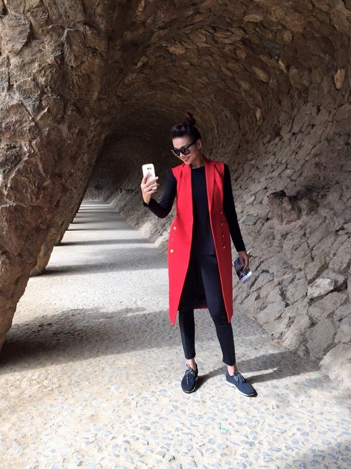 Vest không màu đỏ tạo điểm nhấn thú vị cho trang phục đen đơn giản, năng động của Thanh Hằng.
