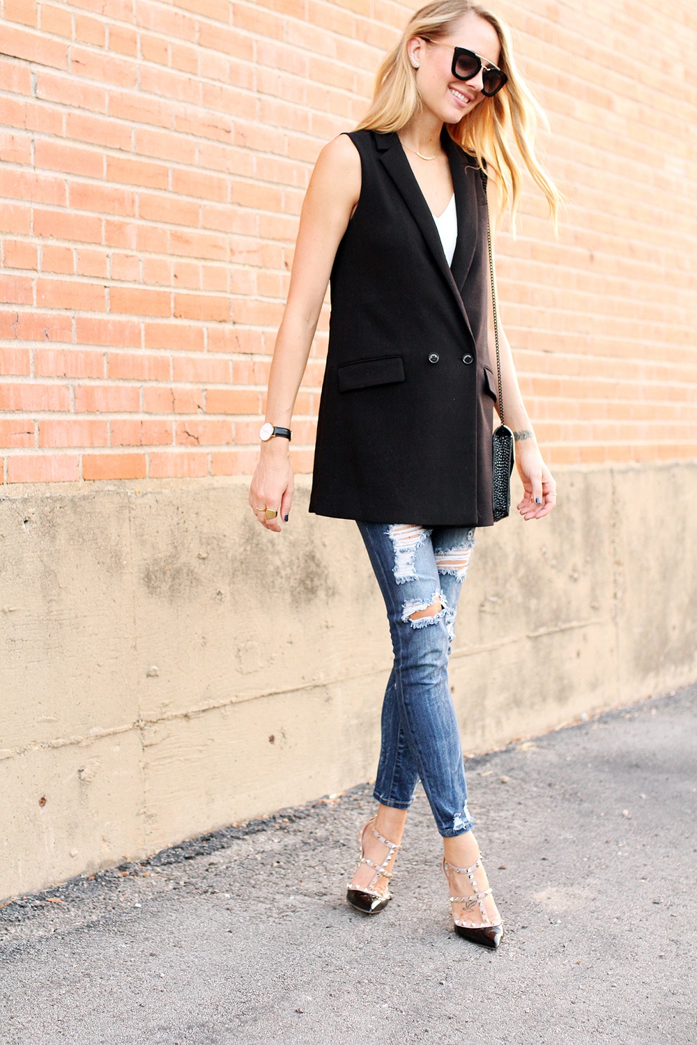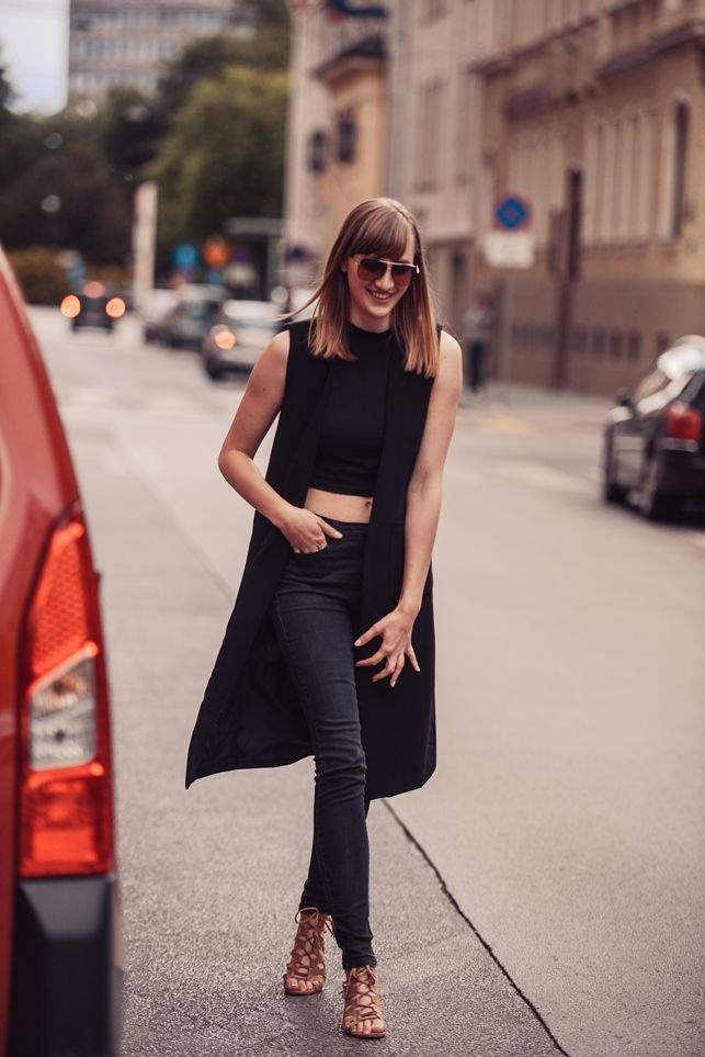 Thời trang xuống phố năng động với vest thắt eo biến tấu và quần skinny. Ảnh: T.Hằng.