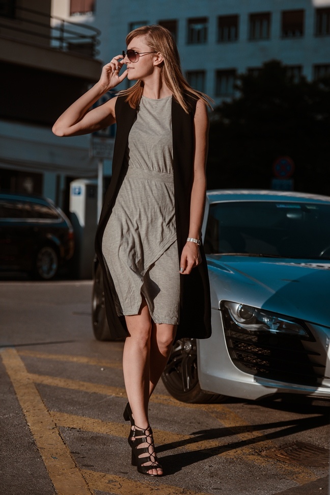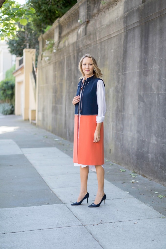 Bên cạnh cách mix cùng quần, bạn có thể sử dụng các mẫu váy liền đơn giản khi mặc vest không tay. Ảnh: FFashion