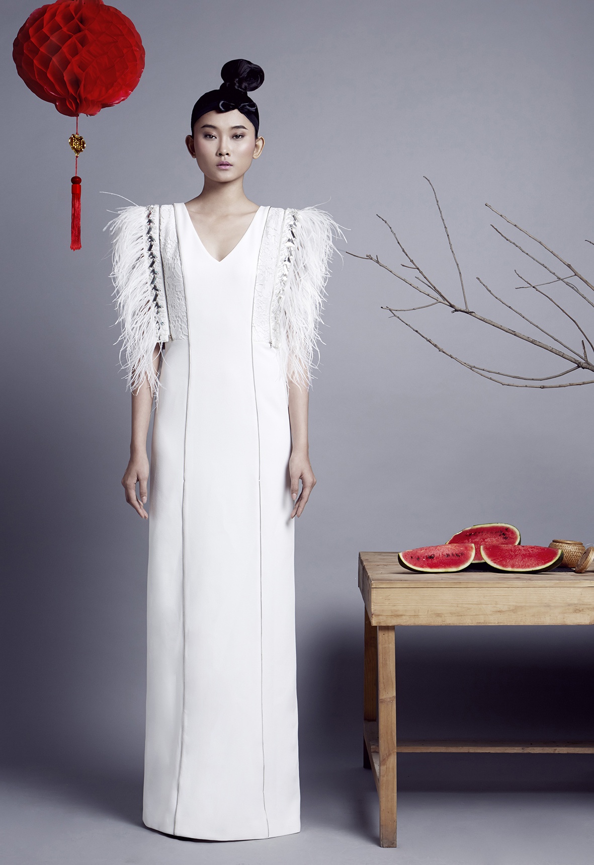 | Trang phục sử dụng đường cắt gọn gàng, dứt khoát. Chi tiết hoa ren và lông vũ ở tay áo giúp bộ đầm màu trơn thoát khỏi sự nhàm chán, đơn điệu. |