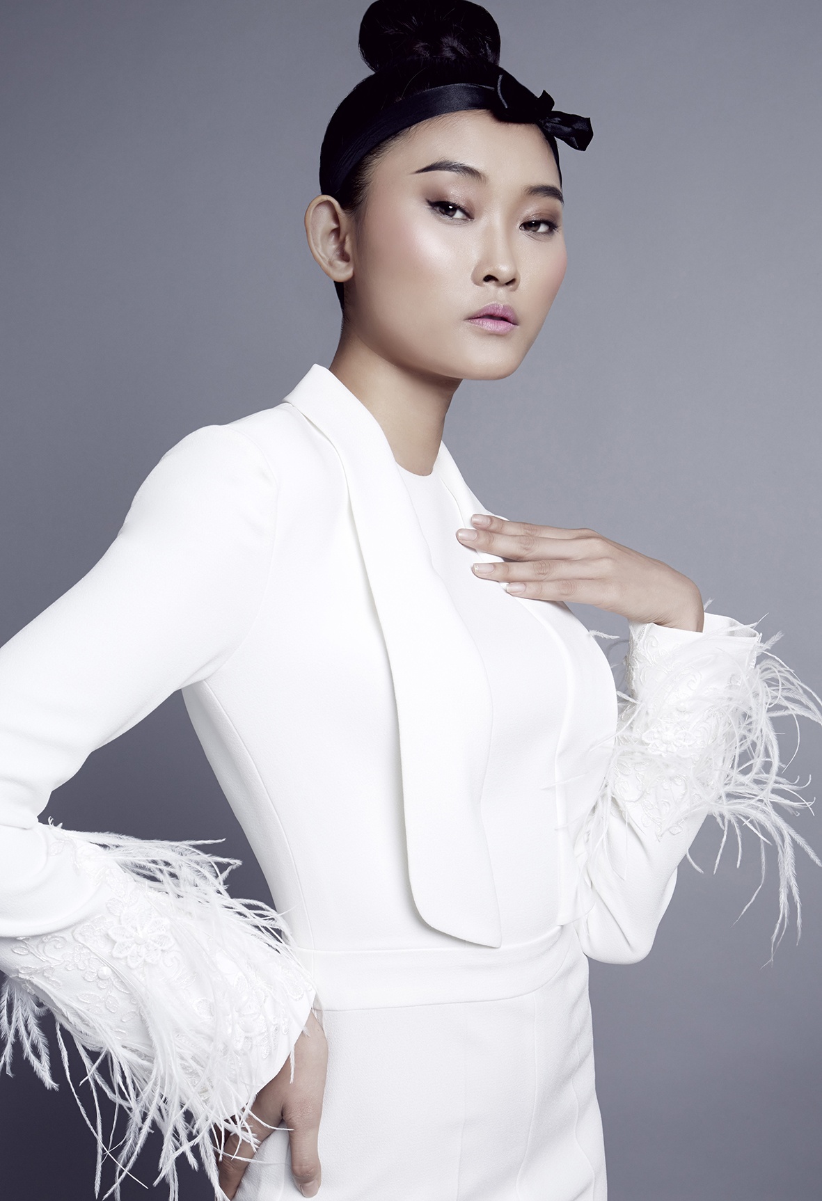 | Chân dài làng mốt Việt diện áo khoác kết lông vũ cầu kỳ ở tay áo. Trang điểm nhẹ và kiểu tóc búi cao theo phong cách Nhật Bản. |
