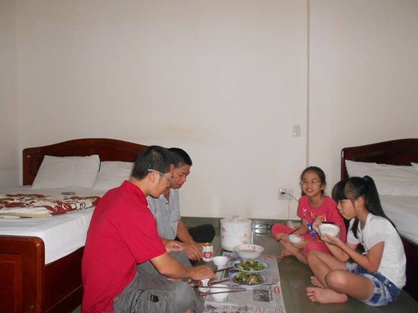| Bố của Thu Hà, Thùy Mai cùng 2 con gái tự nấu cơm và ăn trong khách sạn - một trong những hoạt động được nhắc đến khá nhiều trong bài viết của anh Quốc Thái. |