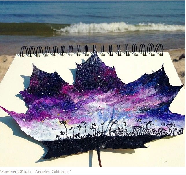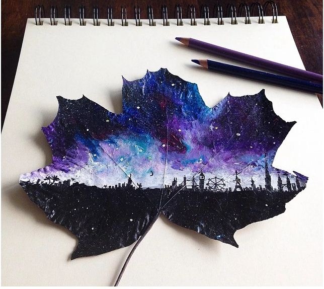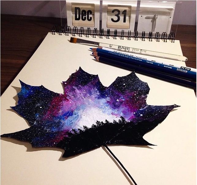 Theo Unworthy, sản phẩm đầu tiên của Joanna là bức tranh bầu trời đêm giao thừa rực rỡ pháo hoa. Trong khi tất cả bạn bè chuẩn bị sẵn sàng để đón bữa tiệc đón năm mới, cô gái 16 tuổi đã dành cả ngày miệt mài để làm khô, vẽ và tô màu lên lá cây. |