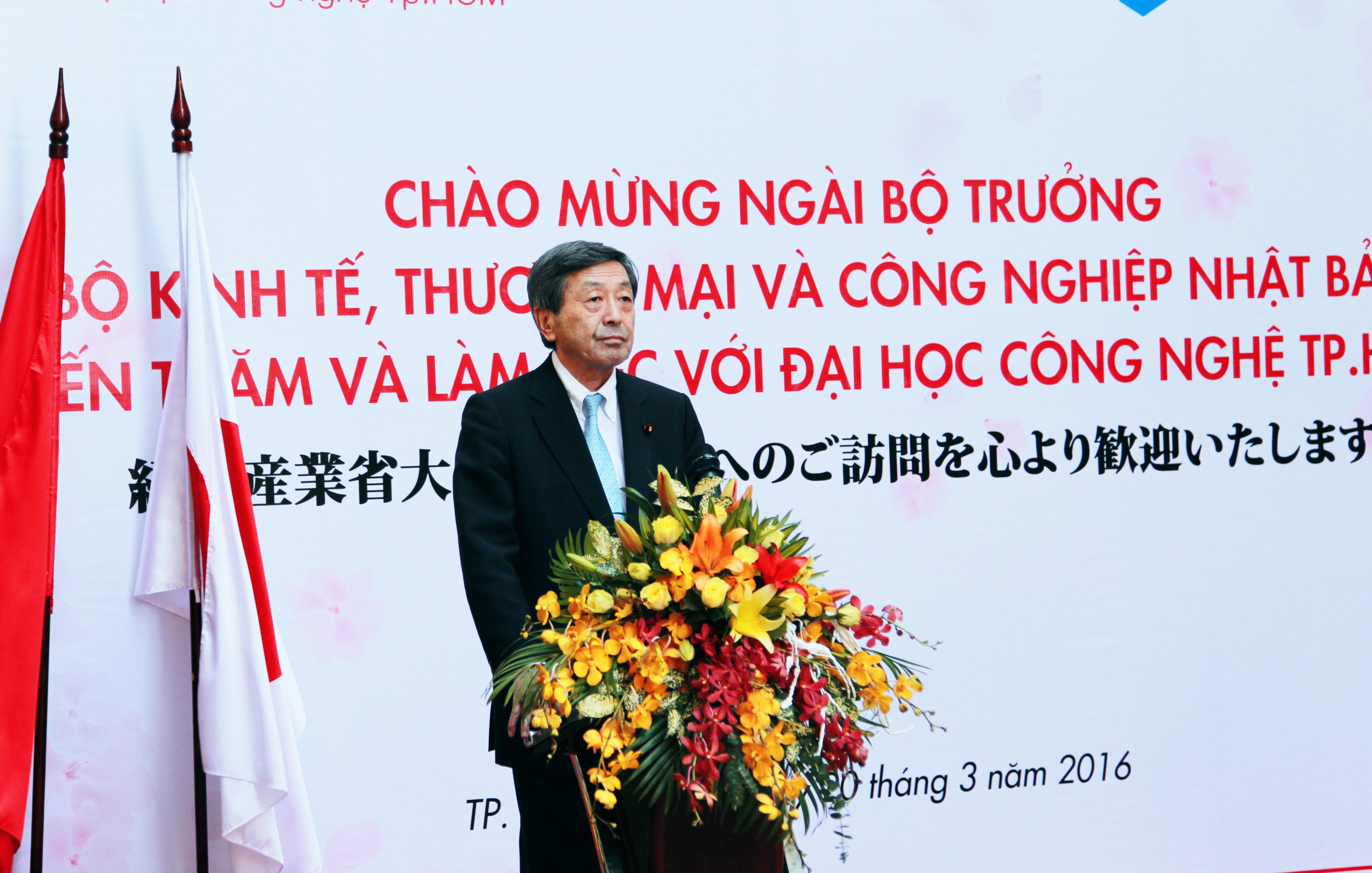 Trong bài phát biểu trước lãnh đạo HUTECH cùng hơn 700 sinh viên đang theo học chương trình Đại học chuẩn Nhật Bản, ông Hayashi Motoo cho biết: “Hiện nay có rất nhiều doanh nghiệp Nhật Bản sản xuất kinh doanh, đầu tư tại Việt Nam. Các doanh nghiệp này đang đóng góp rất tích cực vào sự phát triển kinh tế của Việt Nam. Cùng với việc ký kết Hiệp định TPP, tôi nghĩ rằng đây là cơ hội khẳng định ngày càng mạnh hơn nữa tầm quan trọng của mối quan hệ giữa hai nước Việt Nam - Nhật Bản”. Theo Bộ trưởng Hayashi Motoo, đóng góp không nhỏ vào mối quan hệ hợp tác giữa hai nước sẽ có sự tham gia của những sinh viên đang theo học tại Đại học Công nghệ TP HCM. Ông nhấn mạnh, trong quá trình đào tạo, việc liên kết với các doanh nghiệp là yếu tố quan trọng và HUTECH đã nhanh chóng bắt kịp, đáp ứng yêu cầu này thông qua những hoạt động thiết thực được trường tổ chức trong thời gian qua: Ngày hội việc làm doanh nghiệp Nhật Bản, các chương trình hội thảo, giao lưu với doanh nghiệp Nhật Bản hay tặng học bổng học tiếng Nhật cho sinh viên…