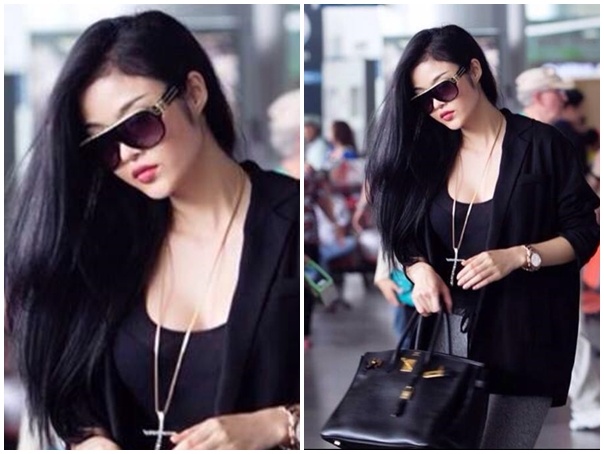 Người đẹp xuất hiện tại sân bay với trang phục tông đen, phụ kiện kính của nhãn Louis Vuitton trị giá lên đến 2.200 USD. Thiết kế có kiểu dáng hiện đại, phần trên ấn tượng với đường viền ánh vàng.