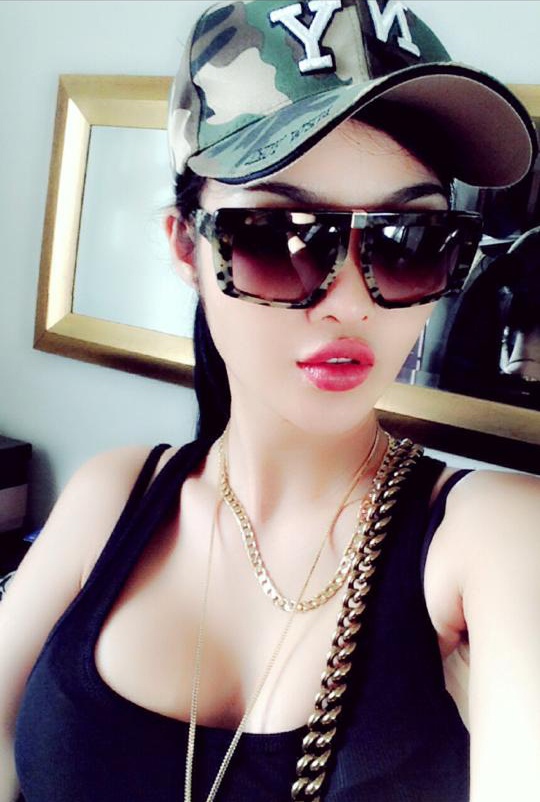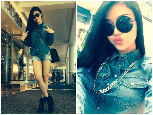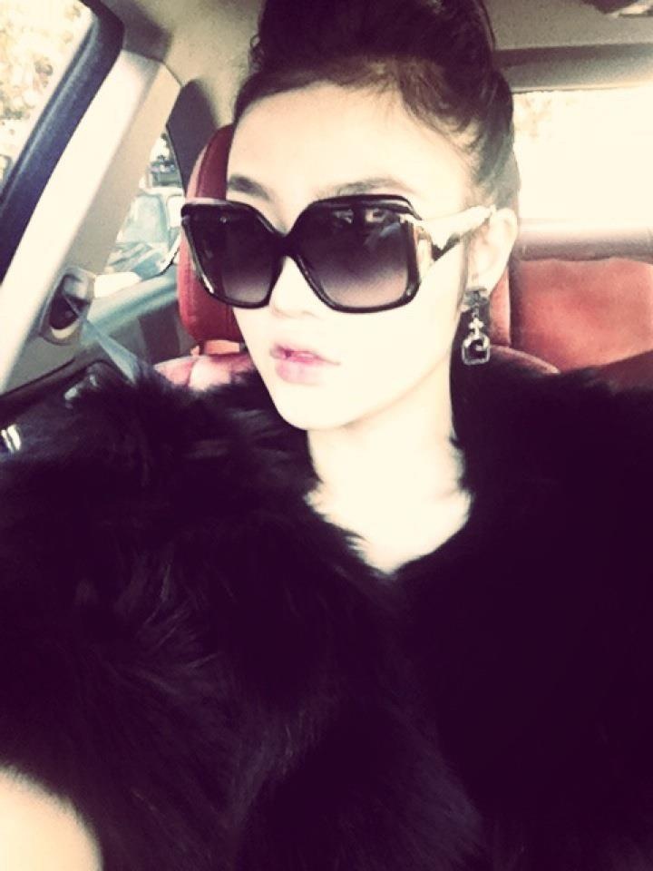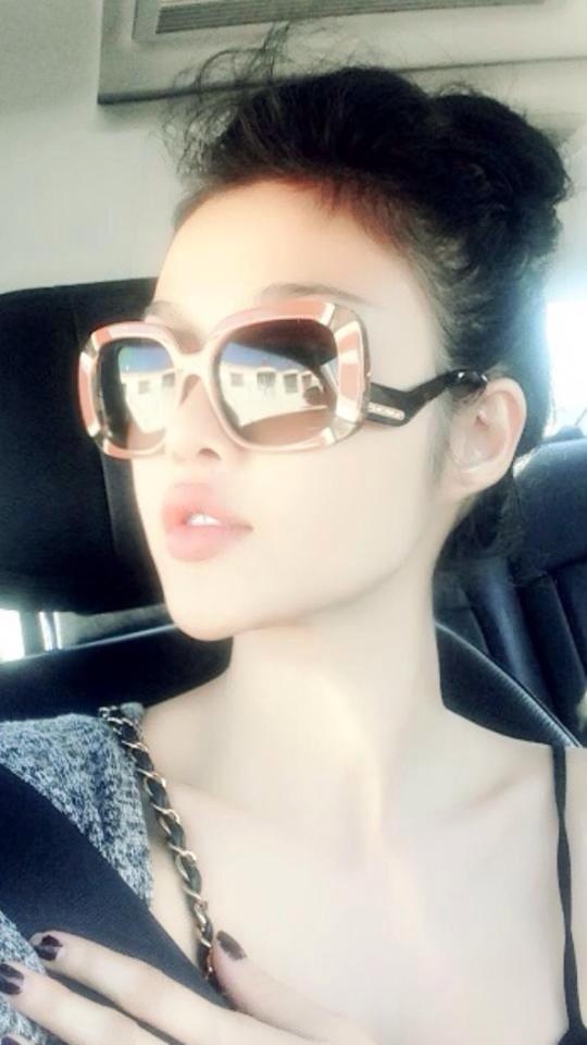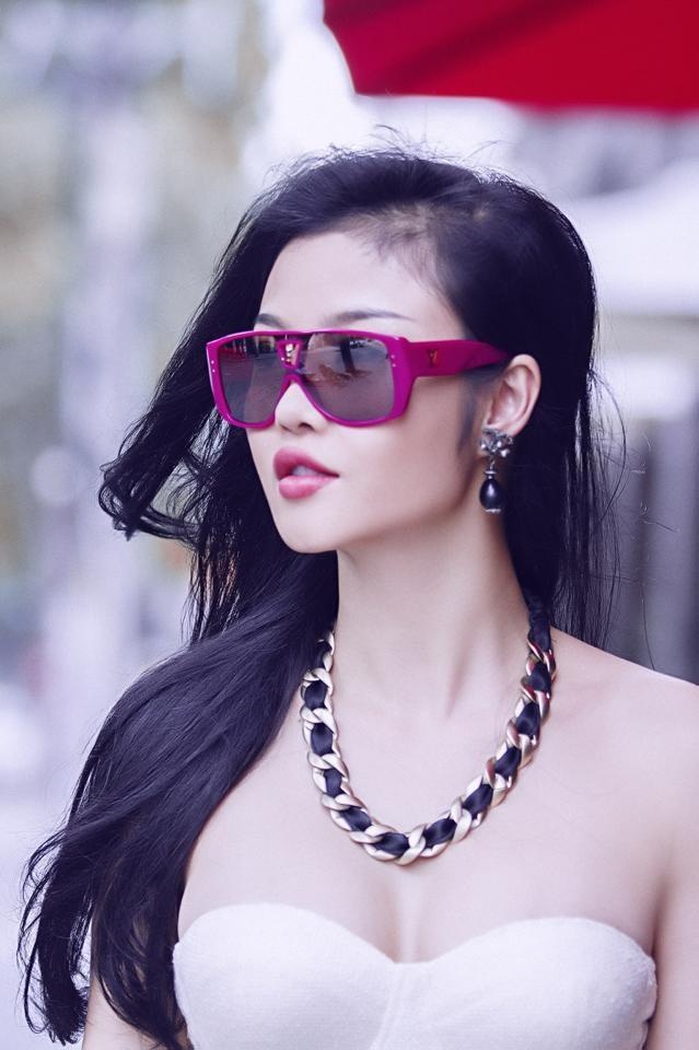 Trong lần trở về Việt Nam mới đây, cô thực hiện bộ ảnh đường phố, trang phục hiện đại phù hợp với chiếc kính của hãng Louis Vuitton, chất liệu kính là plastic, tông màu tím phù hợp với kiểu dáng cổ điển.