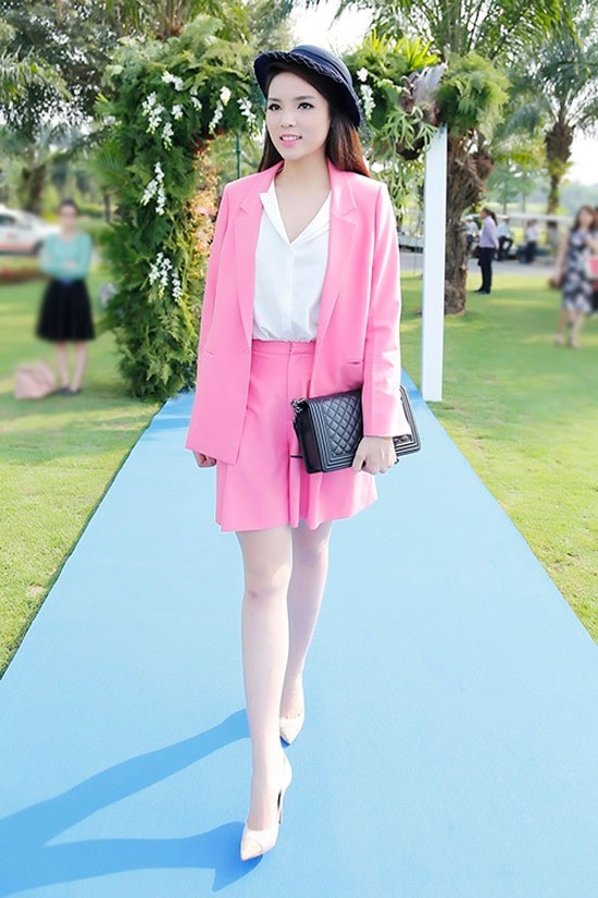 | Chiếc ví gam hồng nhạt cầm tay có giá khoảng 12 triệu đồng được cô mix cùng váy hồng kiêu sa. |