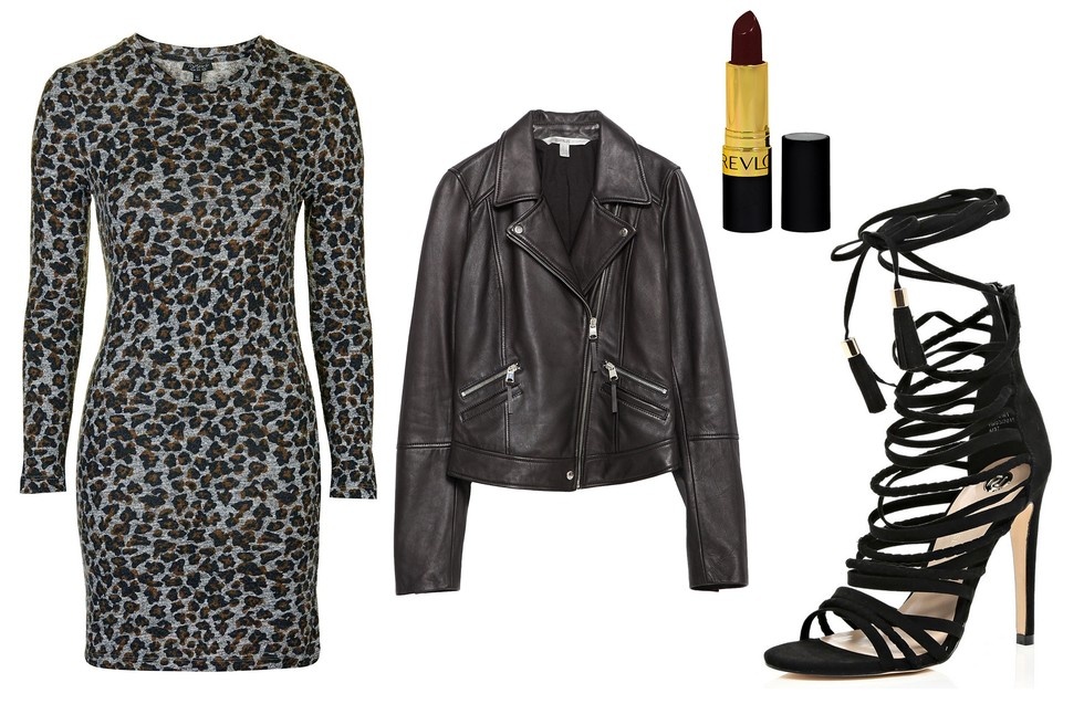 Set đồ của Jamie Chung: váy họa tiết (60 USD), áo khoác da (189 USD), sandals (140 USD), son môi màu cherry đậm (7 USD). |