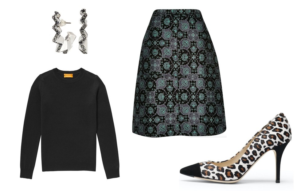 Set đồ của Jennifer: áo sweater (50 USD), chân váy midi (30 USD), giày cao gót họa tiết da báo (99 USD), bông tai (88 USD). |