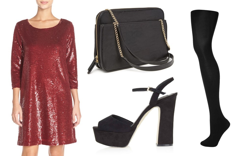 Set đồ của Selena bao gồm đầm sequin (95 USD), sandals đế thô (90 USD), túi đeo vai (14 USD), quần tất đen (14 USD). |