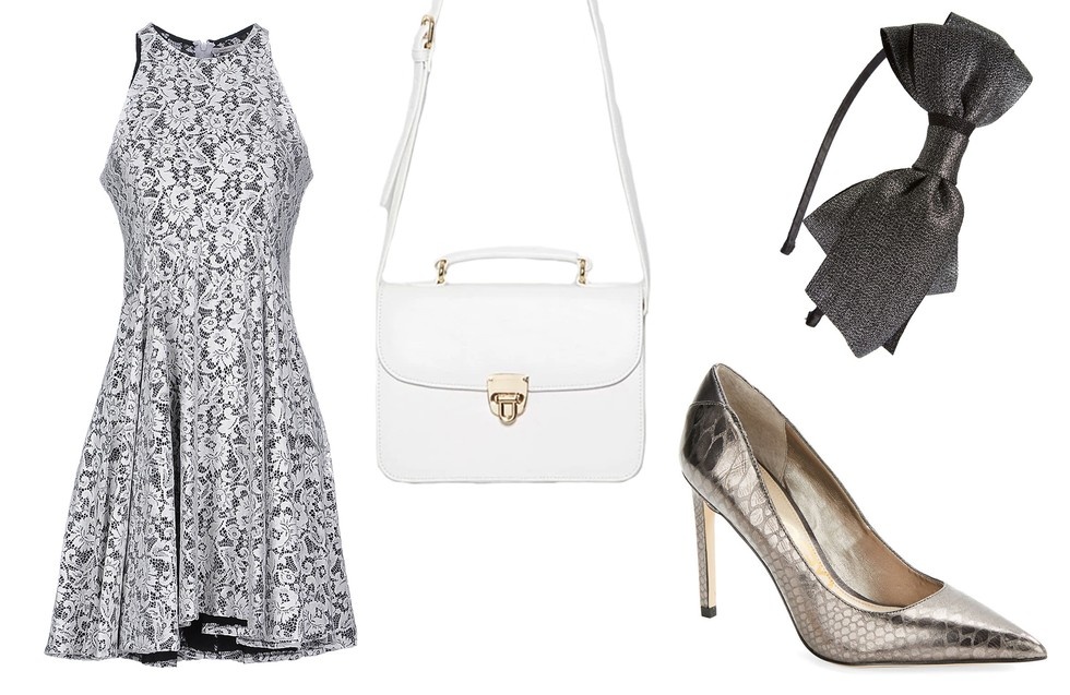 Set đồ của Lupita bao gồm đầm hoa nhí (121 USD), túi da đeo vai (23 USD), giày cao gót da họa tiết (91 USD), băng đô ánh kim (28 USD). |