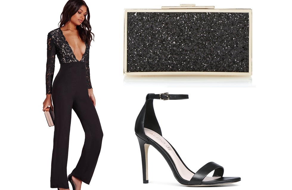 Set đồ của cô nàng bao gồm jumpsuits với áo xẻ cổ sâu (68 USD), sandals cao gót (80 USD), clutch (75 USD). |