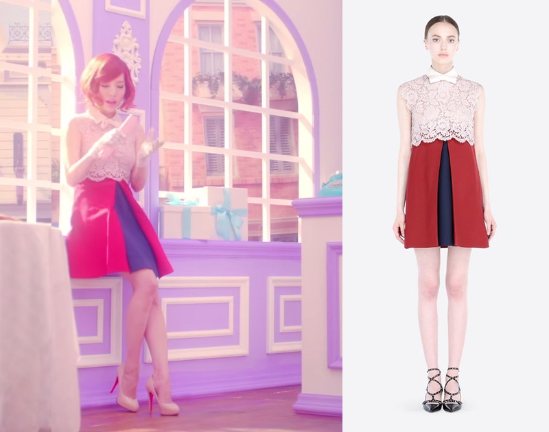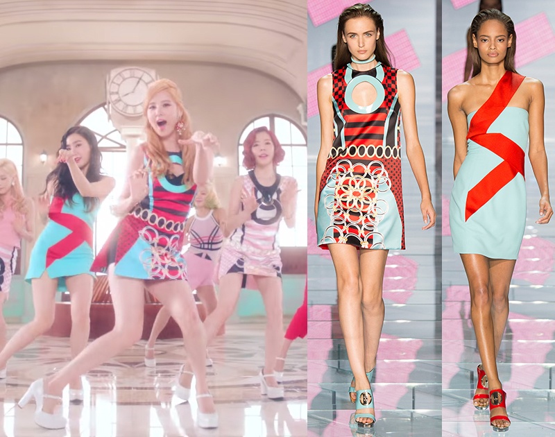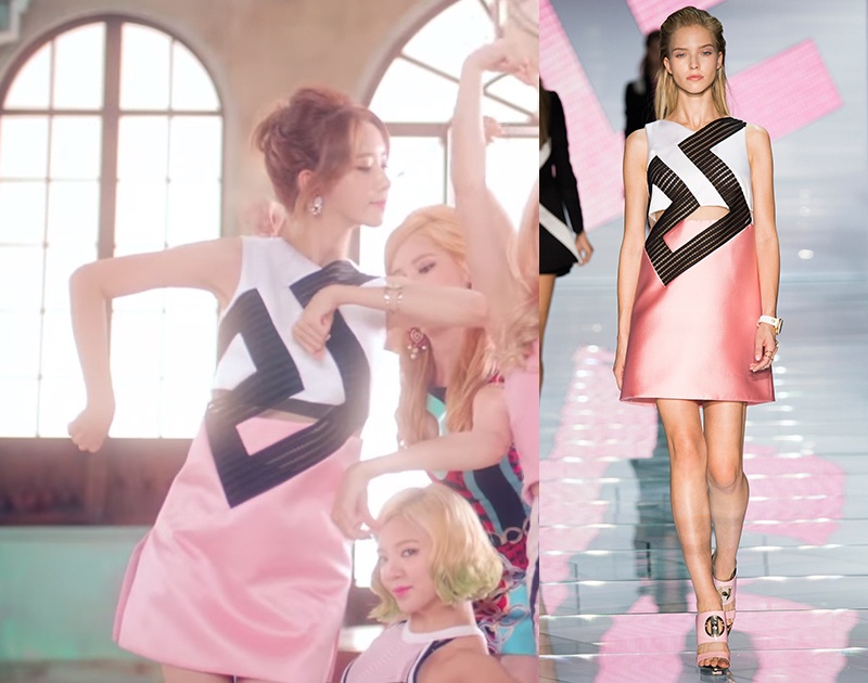 | Ngay trong cảnh đầu tiên, mỗi thành viên của SNSD đều mặc một thiết kế trong bộ sưu tập xuân 2015 của Versace. Đây là lựa chọn khá hoàn hảo bởi màu sắc chủ đạo bộ sưu tập là hồng - màu đại diện của SNSD. Chiếc váy Versace của Yoona có giá 1.040 USD. |