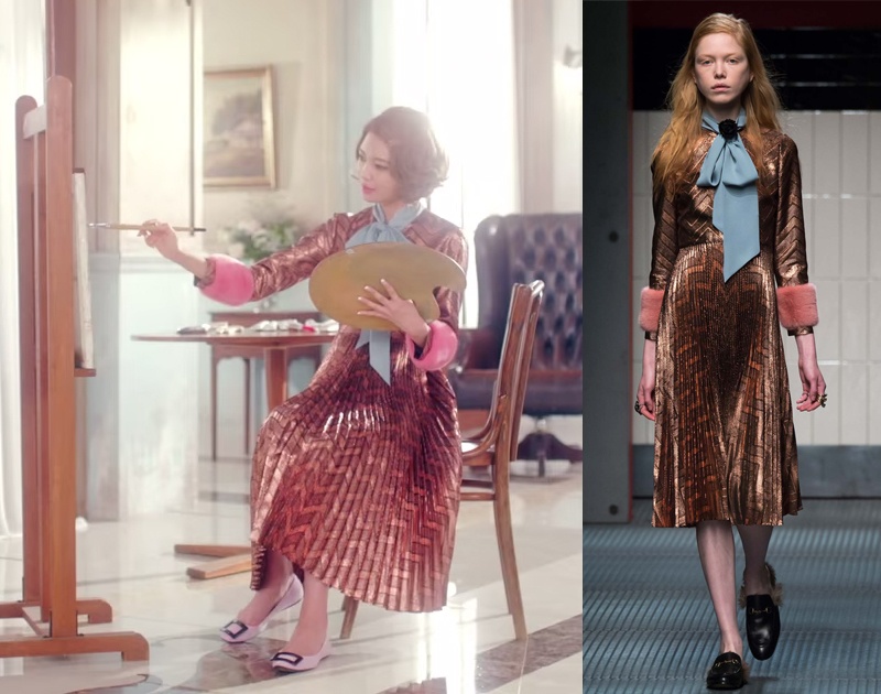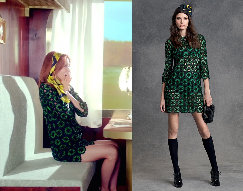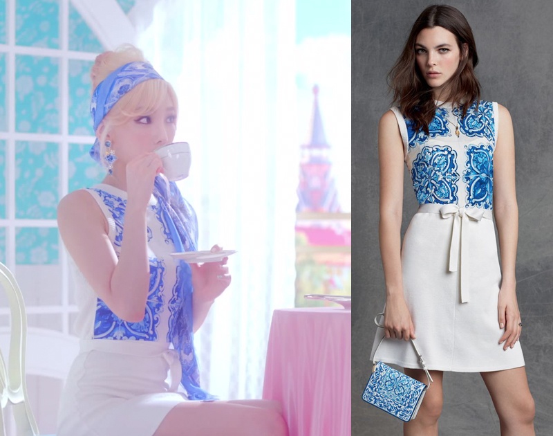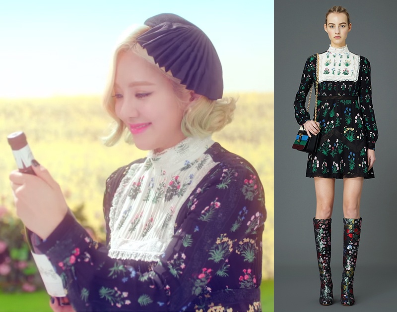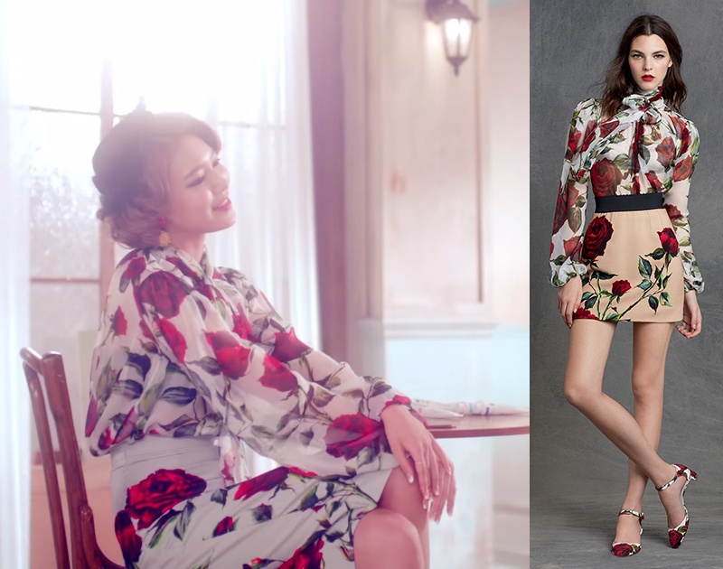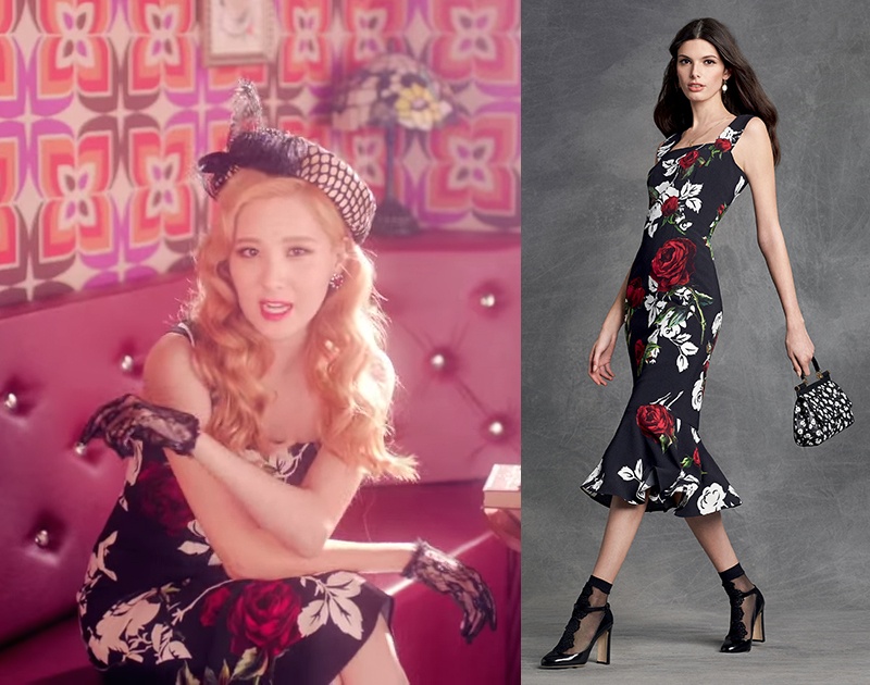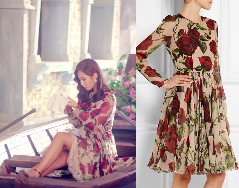 | Trong cảnh hẹn hò, SNSD lại chọn trang phục trong bộ sưu tập thu 2015 của Dolce & Gabba. Chiếc váy họa tiết hoa hồng nữ tính cùng đôi bông tai bắt mắt của Yuri là gợi ý hoàn hảo cho một cuộc gặp gỡ lãng mạn. Thiết kế nổi tiếng này của nhà mốt nước Ý có giá tới 4.995 USD. |