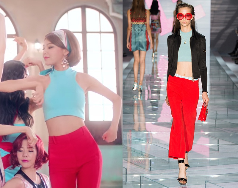 | Chiếc áo crop top duyên dáng của Soo Young là thiết kế bán rất chạy của Versace, có giá tới 850 USD. Hiện tại, mẫu áo này đã hết hàng. Trong khi đó, chiếc quần lụa đỏ sang trọng có giá 775 USD. |