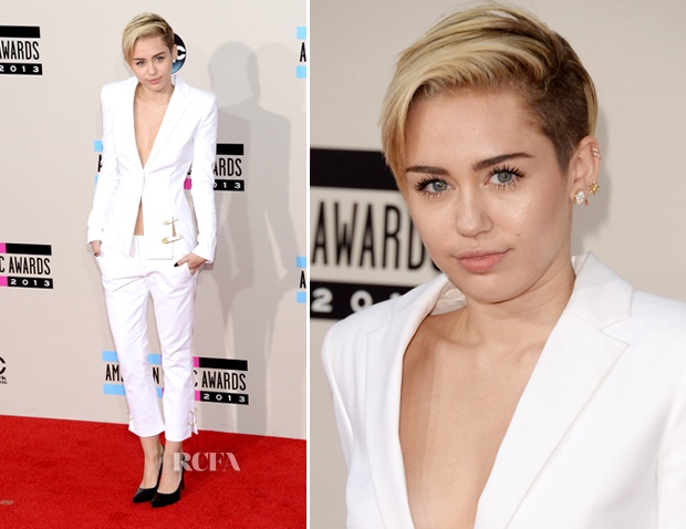 | Miley Cyrus thanh lịch và sexy trong bộ vest trắng hiệu Versus Versace. |