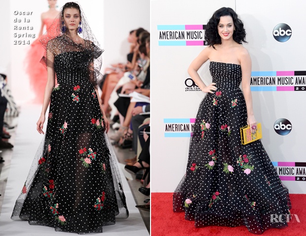 | Katy Perry vãn trung thành với phong cách thời trang "kẹo ngọt" với chiếc váy hoa chấm bi hiệu Oscar De la renta. |
