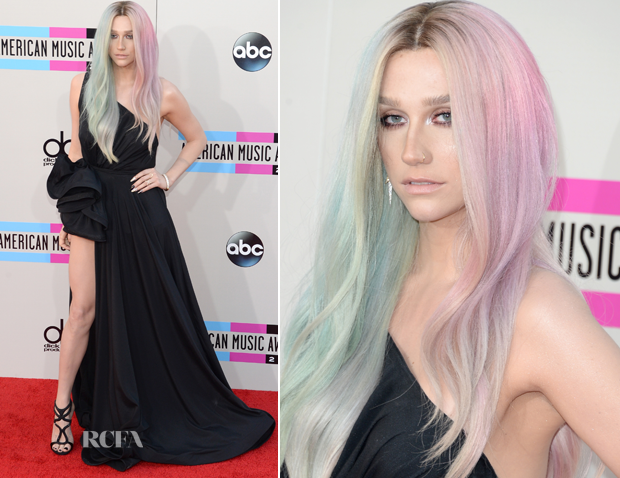 | Kesha cá tính và xinh đẹp trong bộ đầm xẻ đùi, được nhấn bởi khối xếp phồng bắt mắt hiệu Michael Costello. |
