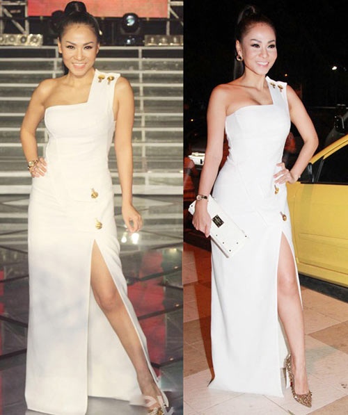 | Thu Minh diện chiếc váy trắng lệch vai và xẻ cao gợi cảm của thương hiệu Versace có giá 150 triệu đồng. |