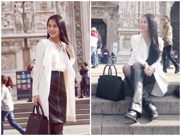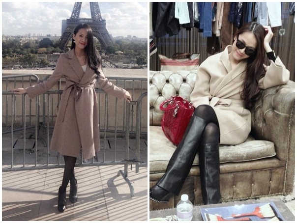 | Trong chuyến du lịch Paris, chân dài mang theo chiếc áo khoác của Zara giá 7 triệu đồng, boot Chanel 750 USD. |