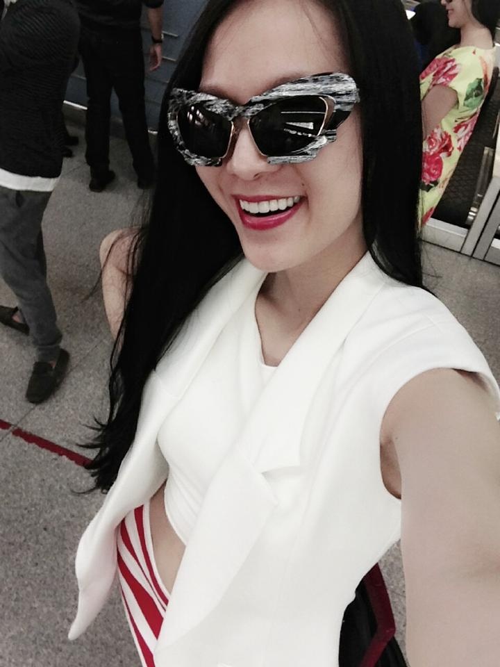 Trong một dịp khác, người đẹp nổi bật nhờ mắt kính Louis Vuiton, túi xách Chanel 5.000 USD.