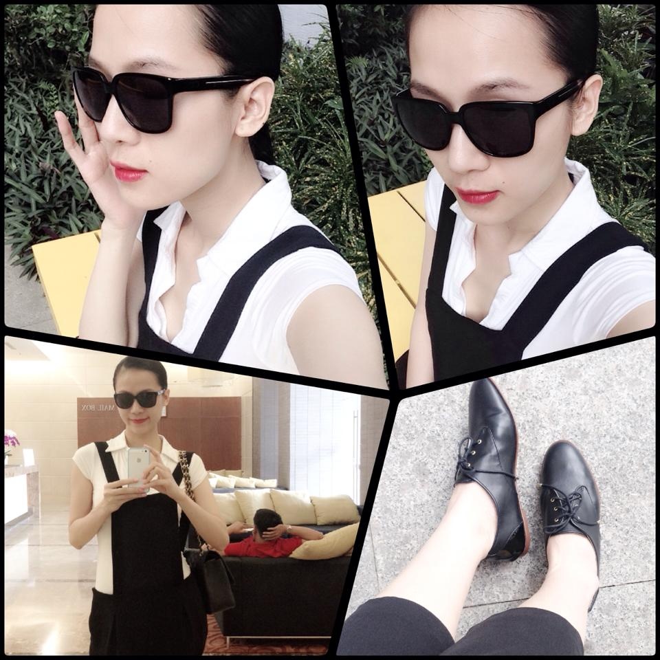 Trong một lần xuống phố, cô chọn phong cách năng động, trẻ trung với yếm vải màu đen, phụ kiện kính râm của Dior, giày của Zara giá 1tr5.