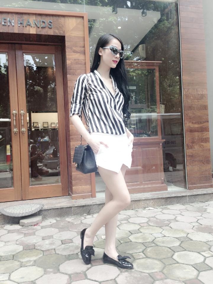 Trong hình bên, Thái Hà nổi bật với phong cách đơn giản và năng động, quần áo thuộc thương hiệu Zara phối hợp cùng mắt kính của Prada.