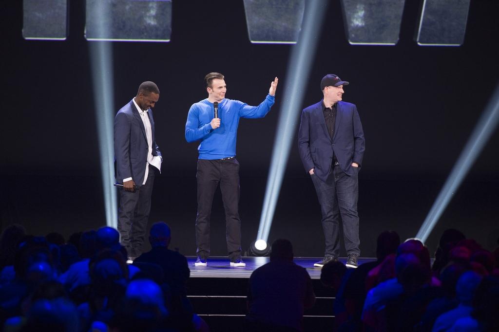 | Anthony Mackie, Crhis Evans và Kevin Feige xuất hiện tại D23 để giới thiệu Captain America: Civil War (2016). |