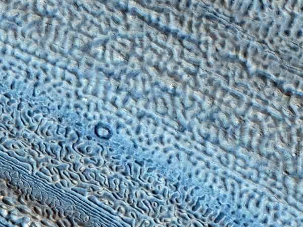 | Một vùng giống như bề mặt của bộ não dưới chân một dãy đồi đóng băng trên sao Hỏa. Ảnh: NASA. |
