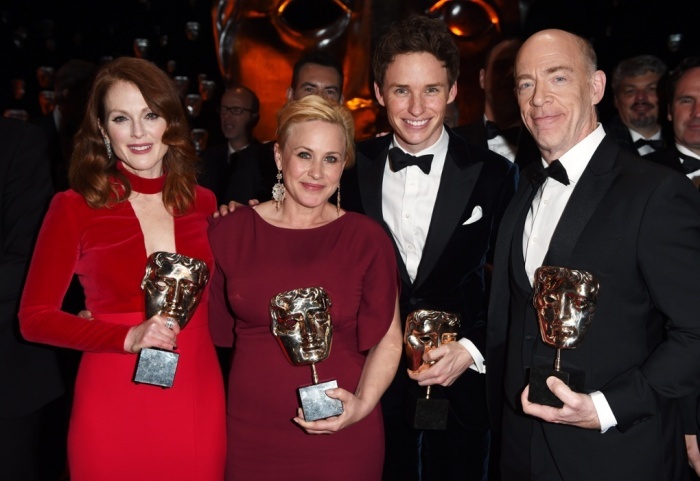 | Bốn diễn viên thắng giải diễn xuất của BAFTA 2015 (từ trái qua): Julianne Moore, Patricia Arquette, Eddie Redmayne, J.K. Simmons. |