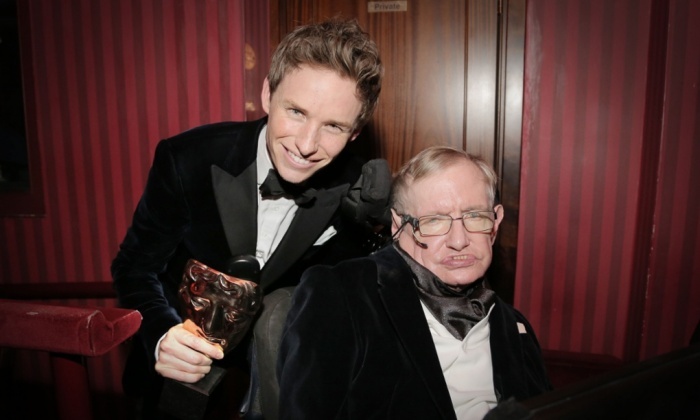 | Eddie Redmayne bên cạnh nhân vật anh hóa thân trong The Theory of Everything, Stephen Hawking. Khoa học gia lừng danh cũng là người trao giải Hiệu ứng kỹ xảo hình ảnh xuất sắc cho Interstellar. |