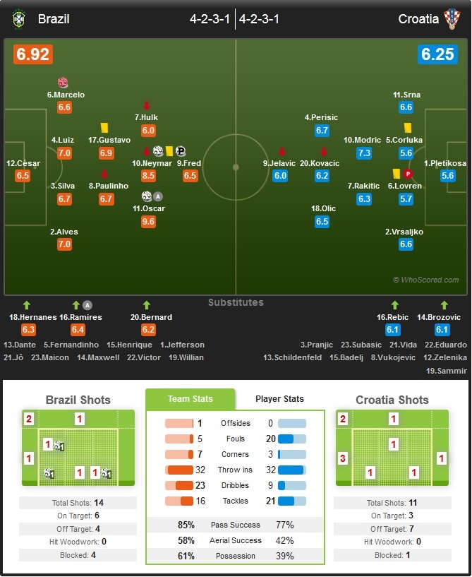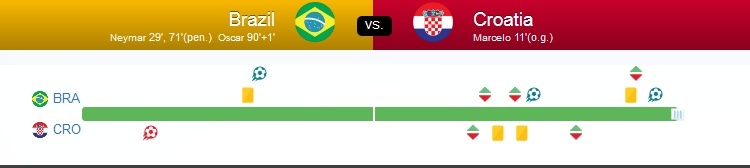 11': Nỗ lực cản phá bóng của Marcelo sau quả tạt của Olic biến hậu vệ Brazil thành tội đồ khi đá phản lưới của Cesar. Tỷ số là 1-0 cho Croatia.