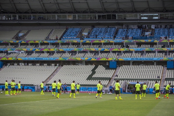 | An ninh được bảo vệ nghiêm ngặt trong suốt buổi tập của tuyển Brazil trên sân Castelao ở Fortaleza. |