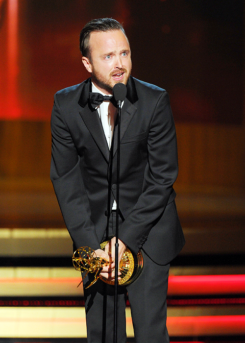 | Aaron Paul tỏ ra hết sức xúc động trên sân khấu khi nhận tượng vàng. |