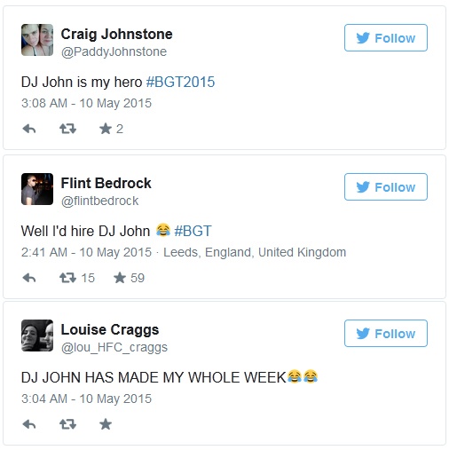 Không chỉ có khán giả trên trường quay, DJ John còn tạo nên một cơn sốt trên mạng xã hội. Sau khi Britain's Got Talent phát sóng, một loạt status (dòng trạng thái) liên quan tới DJ John xuất hiện trên Twitter.