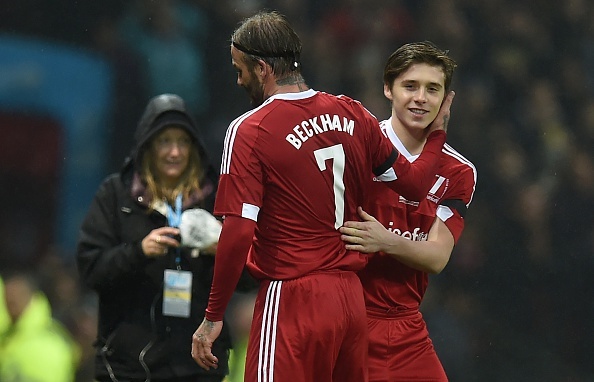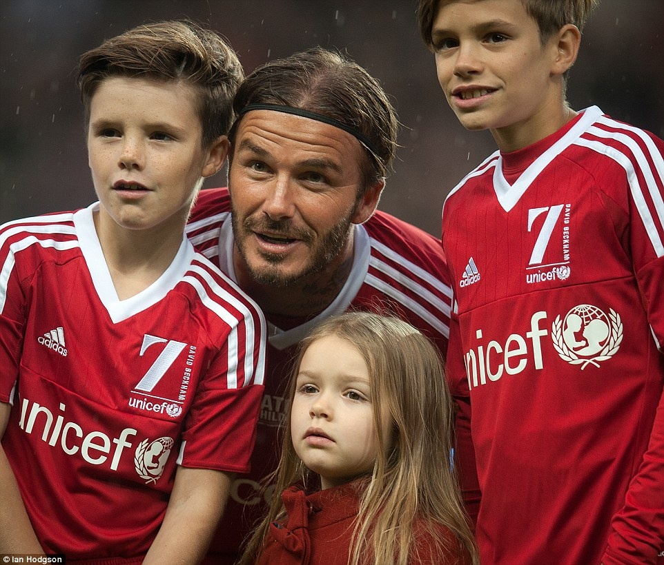 | David Beckham chụp ảnh lưu niệm cùng cậu cả trước khi "Trận đấu vì trẻ em" diễn ra. |