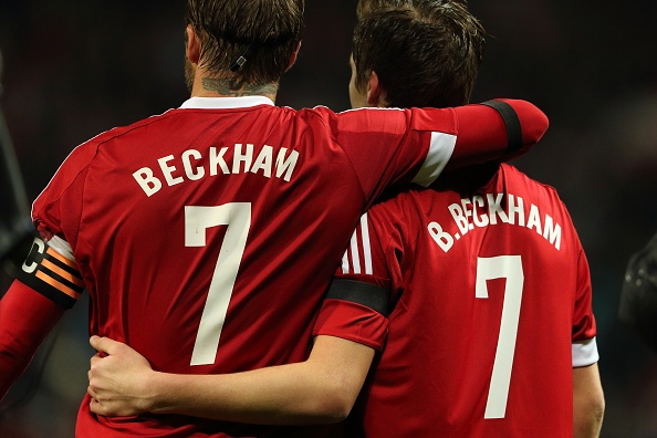 | Hai cha con nhà Beckham cùng đeo áo số 7 của đội Vương quốc Anh và Ireland. Trước khi chuyển sang đầu quân cho Real Madrid năm 2003, David Beckham từng làm rạng danh chiếc áo số 7 ở Manchester United. |